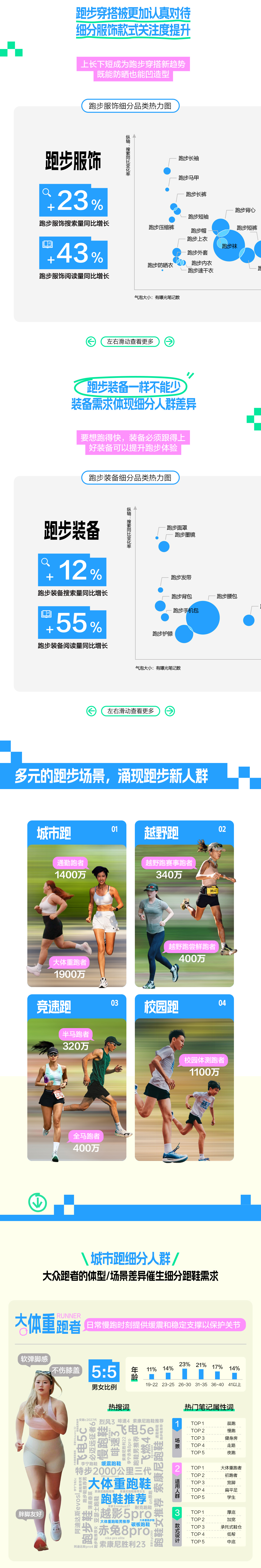 场景的裂变与重构,随之而来的是装备的进化,专业装备随着场景细分而更加具有使用针对性,深入解决用户痛点。在丰富的跑步生态下,围绕跑鞋的「材质款式、场景、人群、外观」等搜索趋势也愈发细分,用户注重跑步穿搭的同时对细分品类的关注度提升,不同的装备需求也侧面呈现出细分人群在跑步品类种草上的差异化特征。