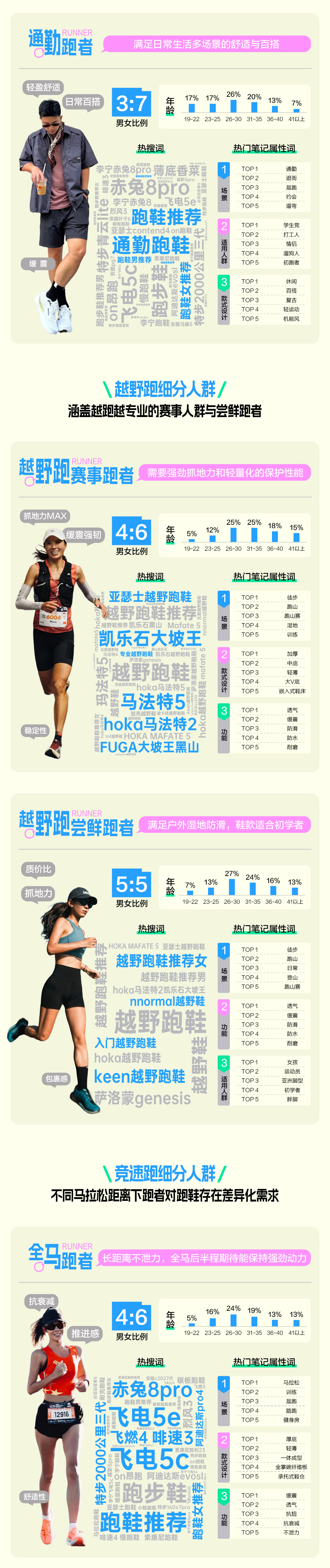 以「城市跑、越野跑、竞速跑、校园跑」为主的四大跑步细分人群诞生。穿梭城市之间的大体重跑者倾向于日常慢跑,追求具有缓震和稳定支撑的跑鞋;热衷越野跑的赛事跑者对跑鞋性能要求更高,偏好强劲抓地力和轻量化产品;擅长竞速的全马跑者更看重跑鞋的长距离表现与综合体验;而校园体测跑者重视日常出行和体测环境下的场景需求,舒适&缓震防滑成为种草的核心要素。