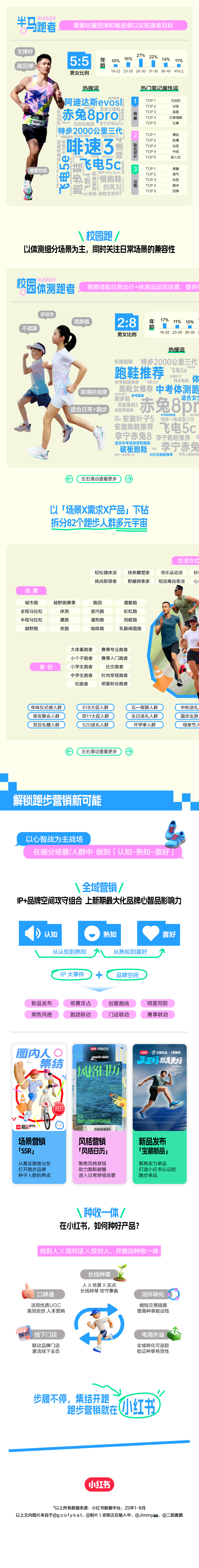 通过精细化拆分多元跑步人群的底层需求,小红书基于「场景X需求X产品」的种草逻辑,锚定跑步品类用户心智战场,以场景营销+风格营销+新品发布的组合出击,打造出IP+品牌空间攻守组合的全域营销链路,帮助更多品牌实现从建立初步认知到完成心智塑造的全面影响力,推动种收一体高效化落地。