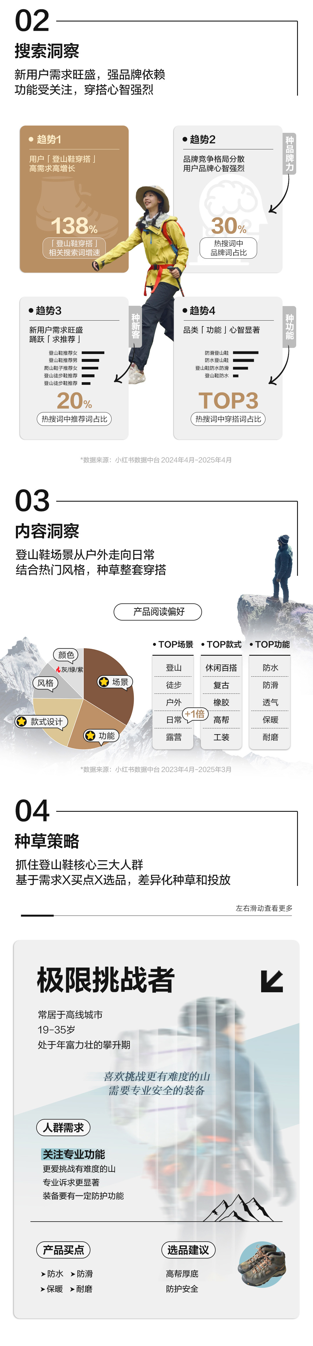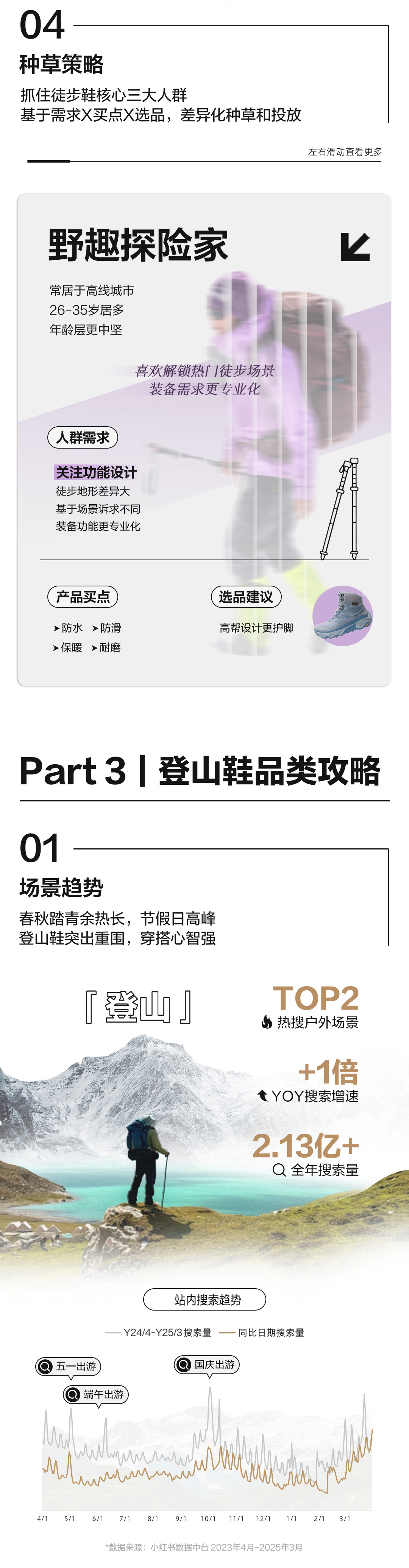 从24年户外品类搜索词属性分布来看,户外兴趣用户的需求已从单一冲锋衣转向鞋/裤/包等全套户外装备,户外装备需求被全面激活。其中,户外鞋凭借精准的功能细分与场景适配能力,跃升为仅次于户外服装的第二大品类,展现出强劲的市场潜力。小红书基于平台中海量内容洞察,精准捕捉人群需求,帮助众多户外运动品牌预判趋势风向,构建从内容种草到消费转化的全链路营销矩阵,实现品牌声量与销量的双重跃升。